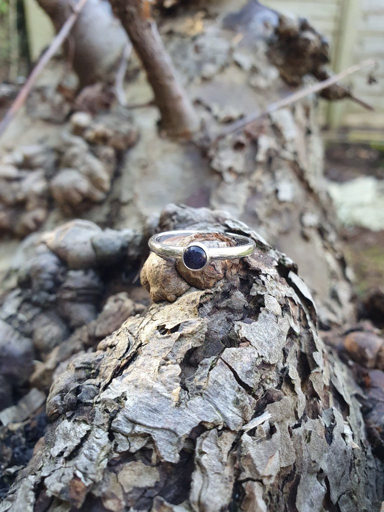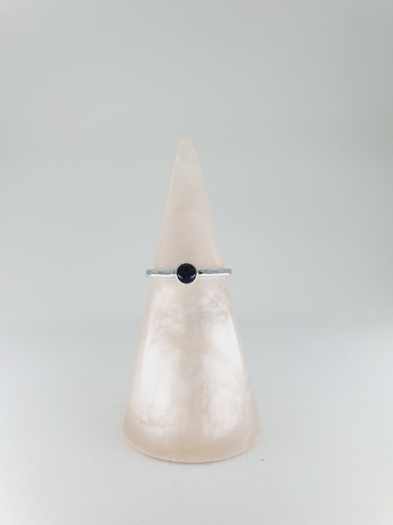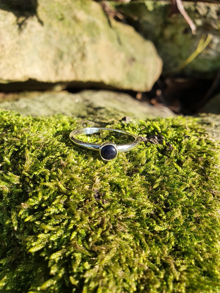 This is a 5mm blue goldstone cabochon, set in a sterling silver bezel, on a slim sterling silver band.