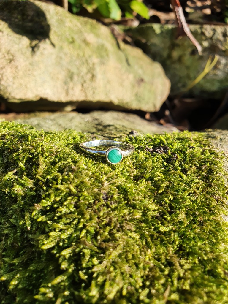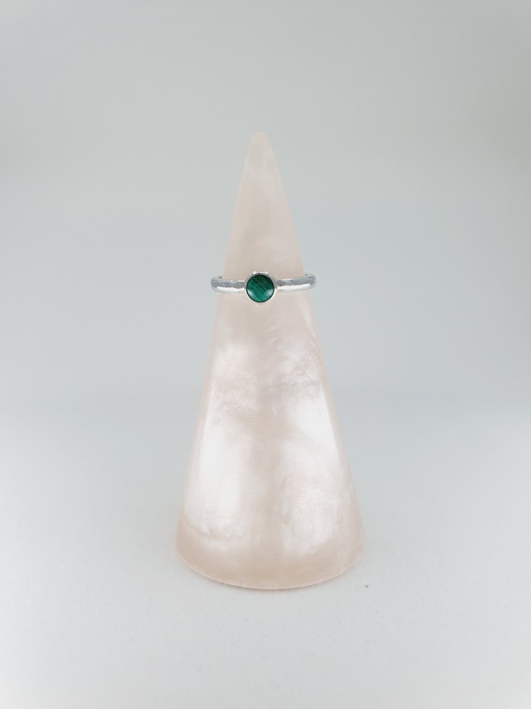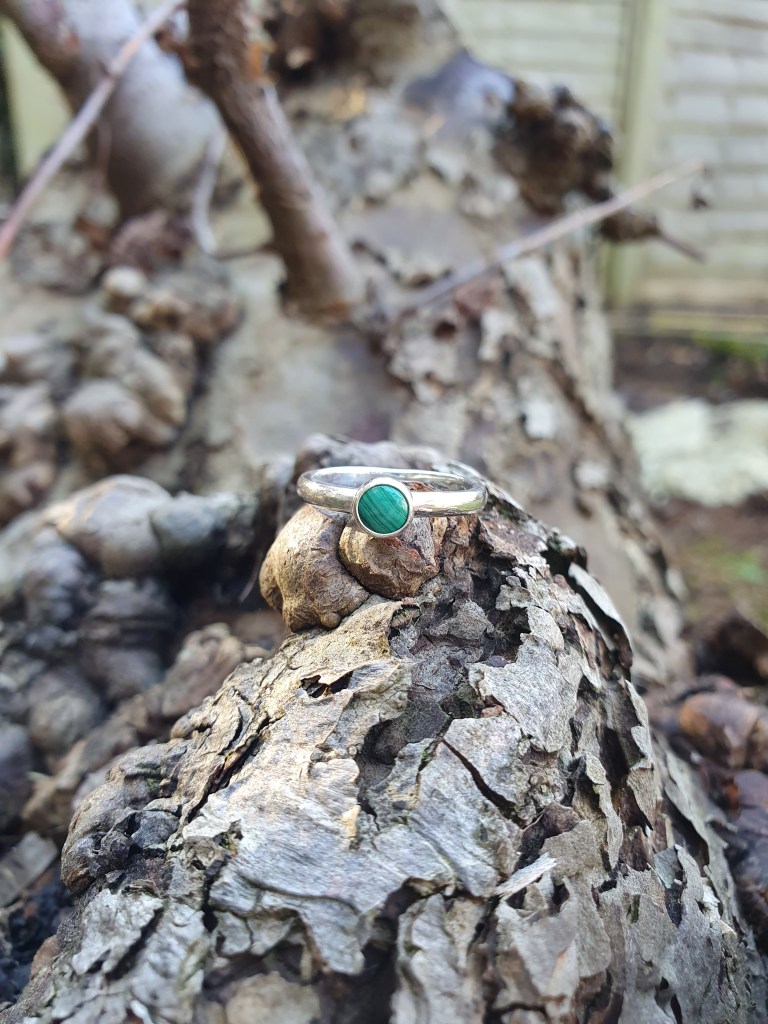 A 5mm Malachite cabochon, set in a sterling silver bezel, on a slim sterling silver band.