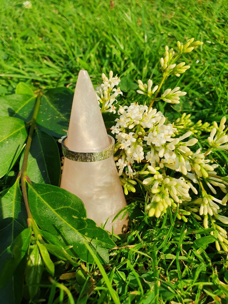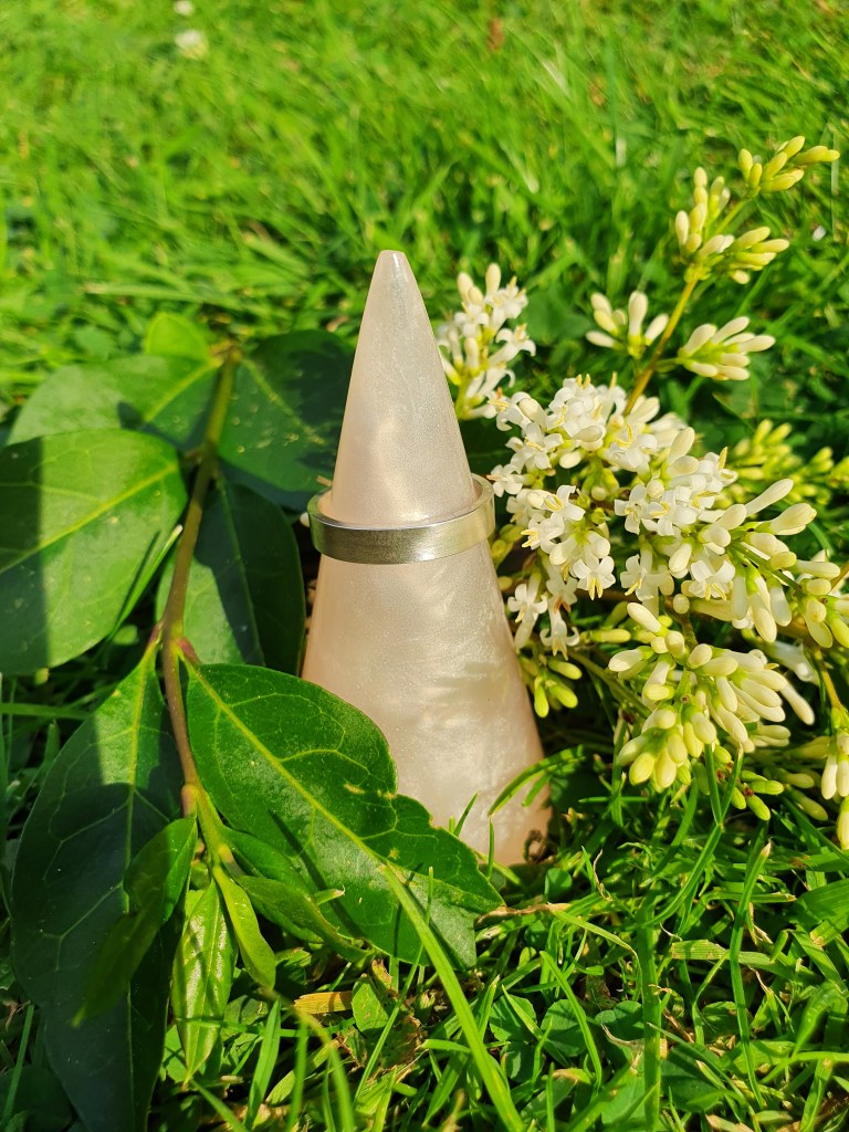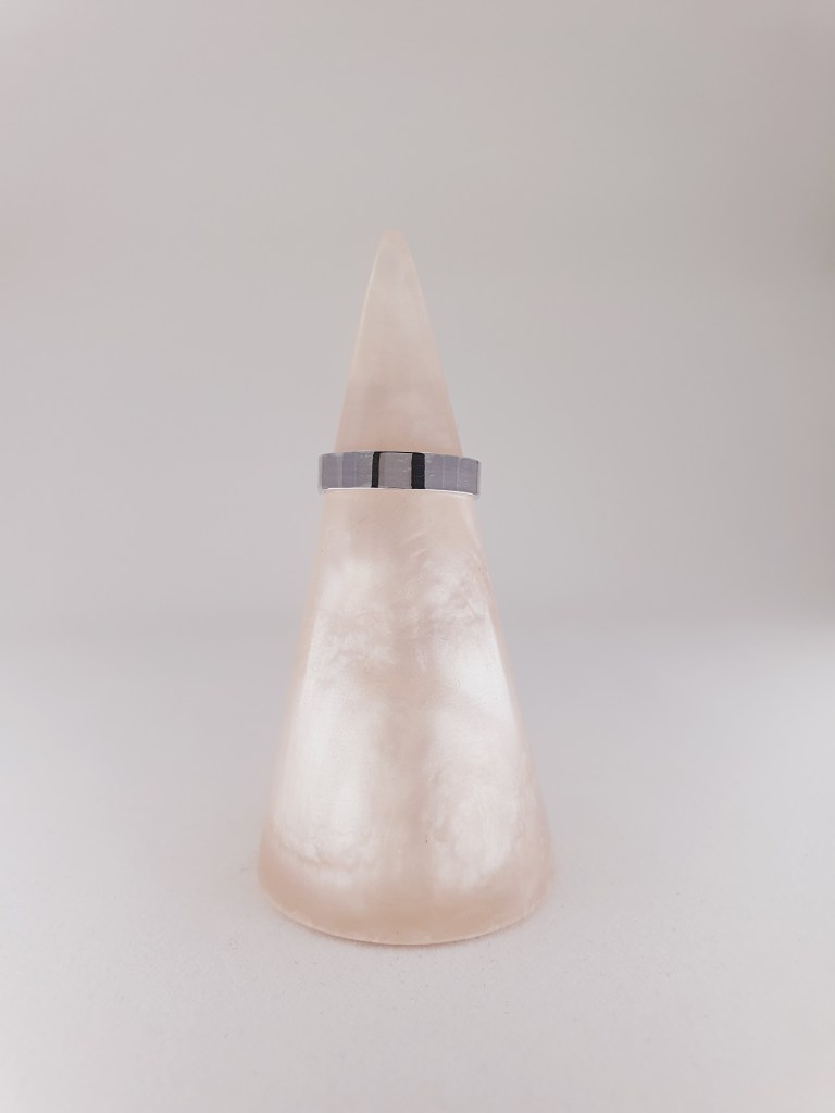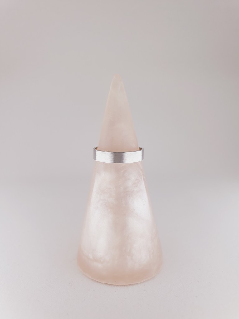 A 4 mm x 1.3 mm rectangular band, in a hammered, satin or shiny finish