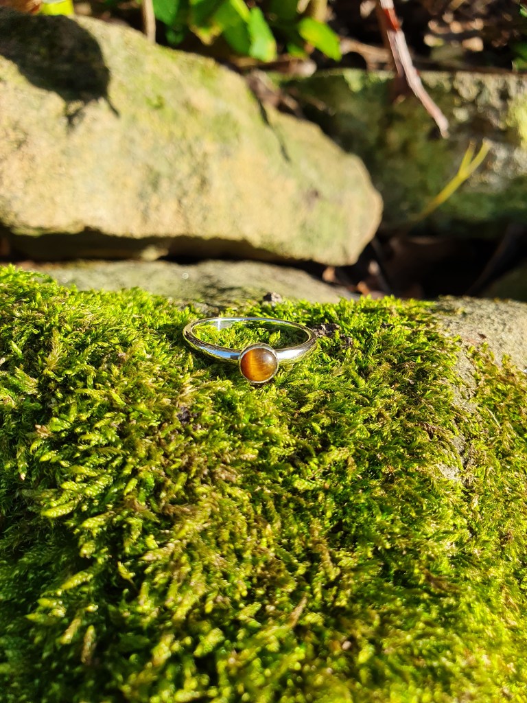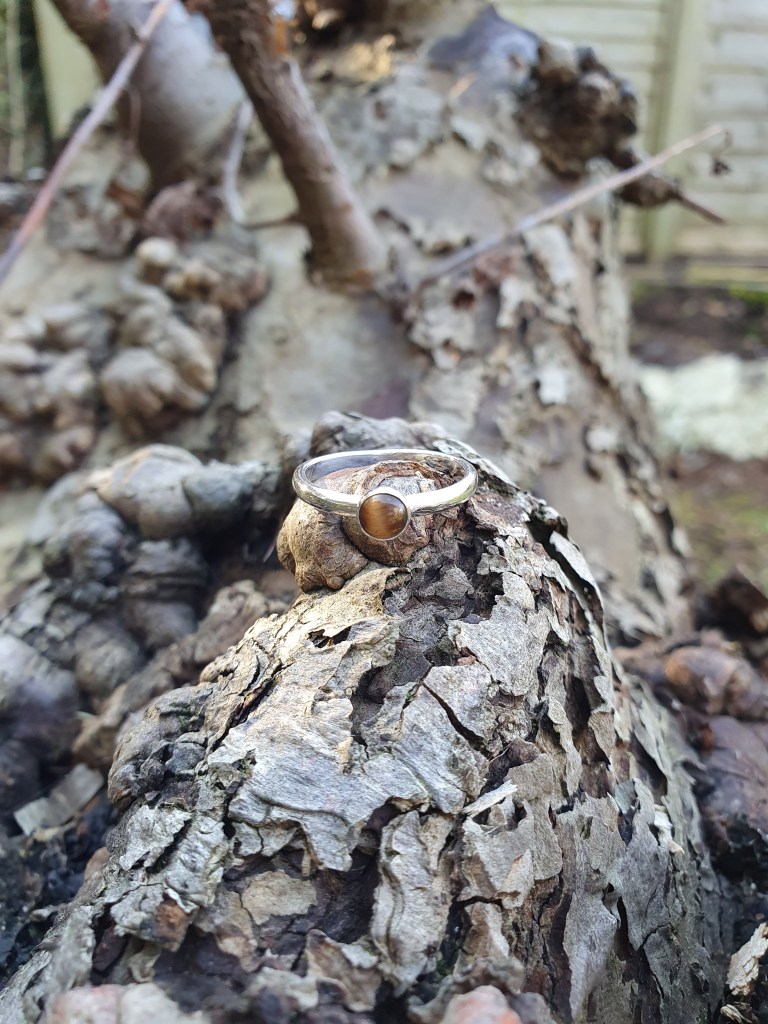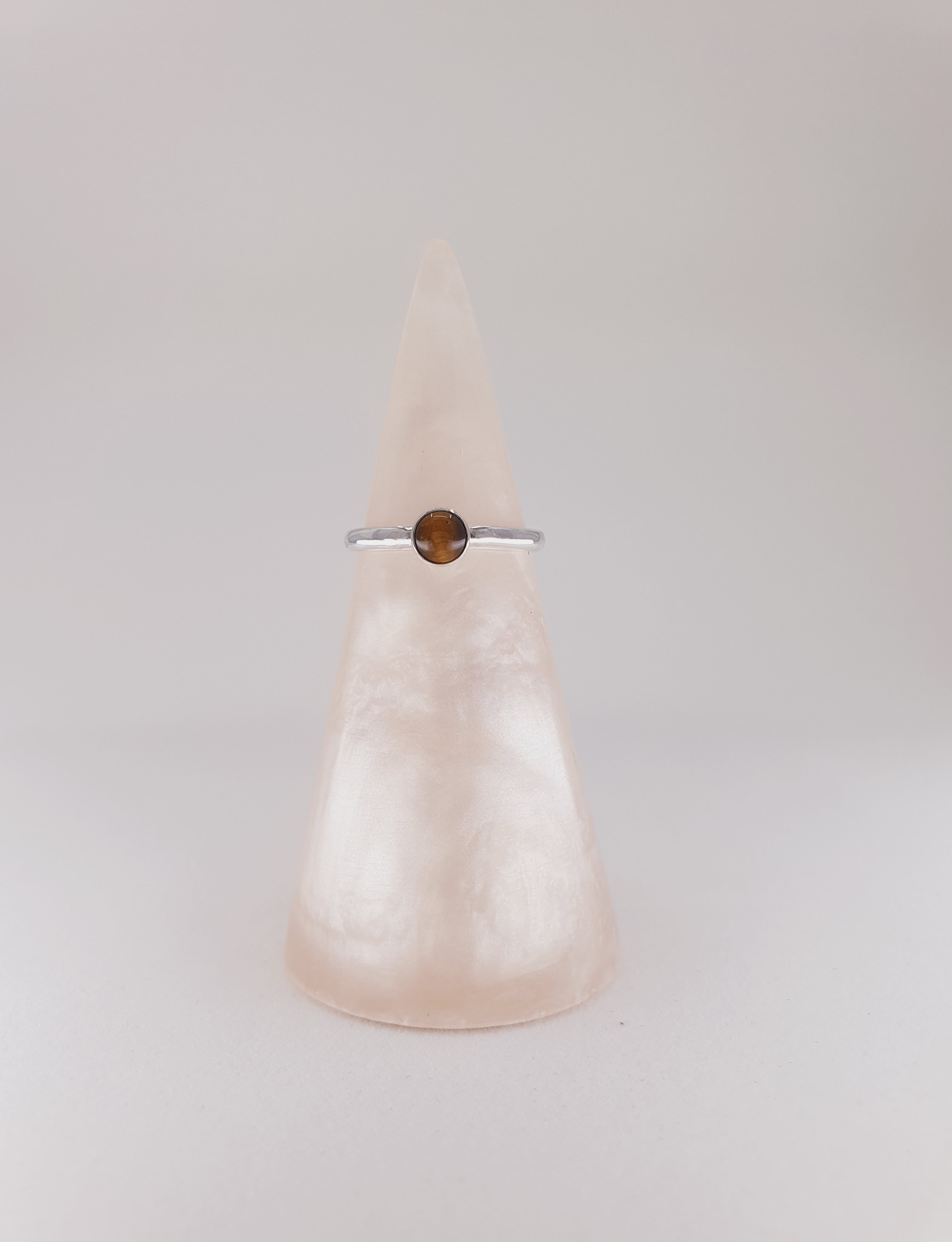 A 5mm Tigers Eye cabochon, set in a sterling silver bezel, on a sterling silver band.