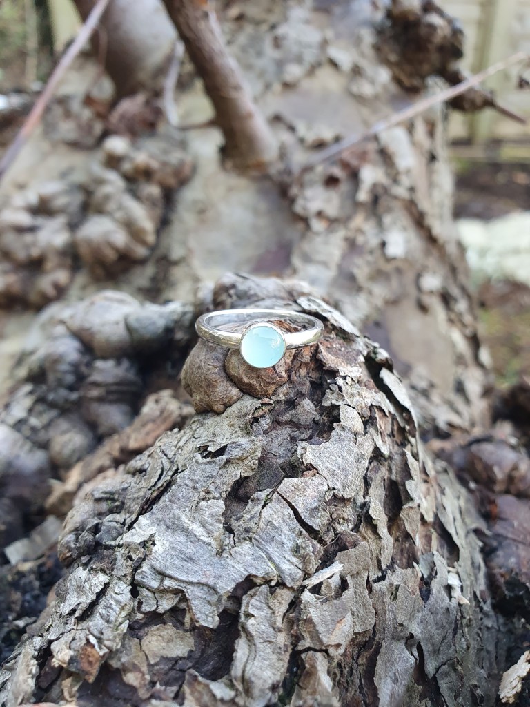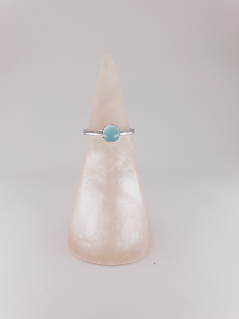 A 6mm turquoise blue chalcedony, set in a sterling silver bezel, on a slim sterling silver band.
